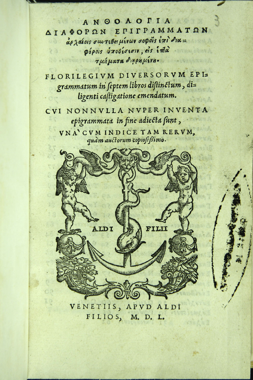 Anthologia diaphoron epigrammaton archaiois suntetheimenon sophois epi diaphorois ypothesesin, eis epta tmemata dieremene. Florilegium diuersorum