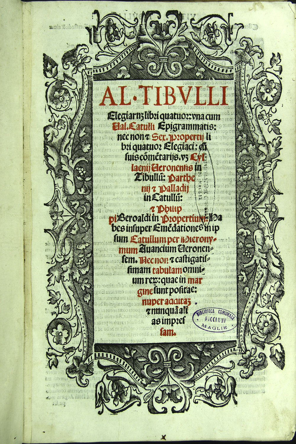 Al. Tibulli elegiarum libri quatuor: una cum Val. Catulli epigrammatis: necnon et Sex. Propertii libri quatuor elegiaci: cum suis commentarisjs [...] CyllaenijVeronensis in Tibullum: Parthenij et Palladij in Catullum et Philippi Beroaldi in Propertium. Habes insupewr emendationes in ipsum Catullum per Hieronymum Avancium Veronensem