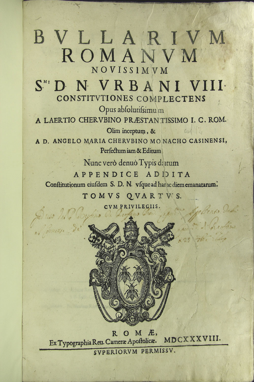 Bullarium Romanum nouissimum a b. Leone Magno, vsque ad S.D.N. Vrbanum 8., opus absolutissimum Laertij Cherubini ... Tertio nunc editum a d. Angelo Maria Cherubino ..., qui vt in altera editione quartum tomum perfecit, ita nunc Constitutiones S.D.N. Vrbani 8. vsque ad hanc diem emanatas addidit nec non vitas & icones omnium pontificum. Appendicem insuper suis locis restituit, indices locupletauit, opusque totum recensuit. Tomus IV